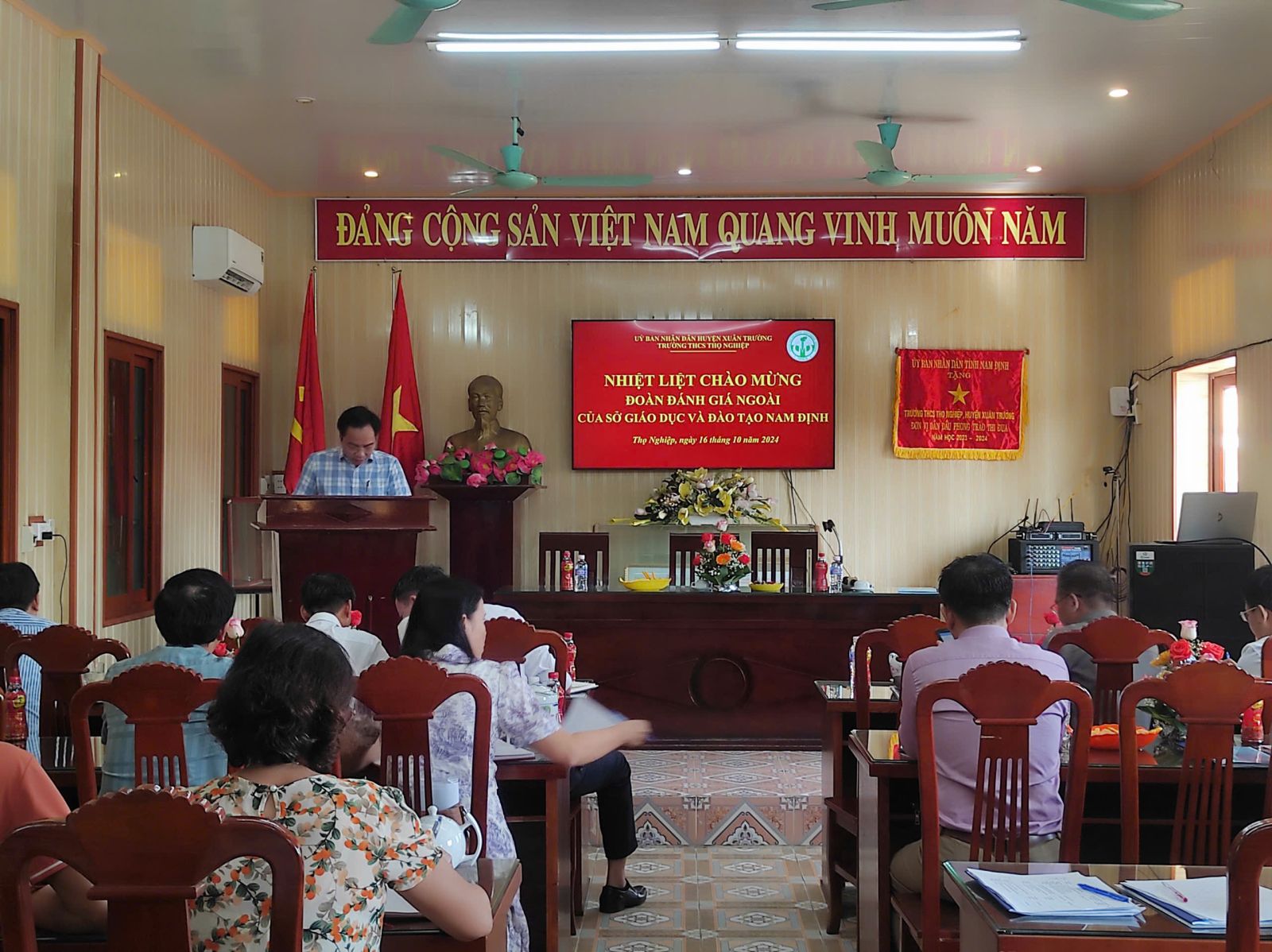 Thực hiện Kế hoạch công tác, chiều ngày 16/10/2024, đoàn công tác đánh giá ngoài của Sở GD&ĐT Nam Định do thầy giáo Ngô Hà Vũ – Phó trưởng phòng giáo dục trung học làm trưởng đoàn đã về thăm và làm việc tại nhà trường. Tham gia đoàn công tác còn có các thầy giáo là lãnh đạo, cán bộ, chuyên viên Phòng GD&ĐT huyện Xuân Trường.