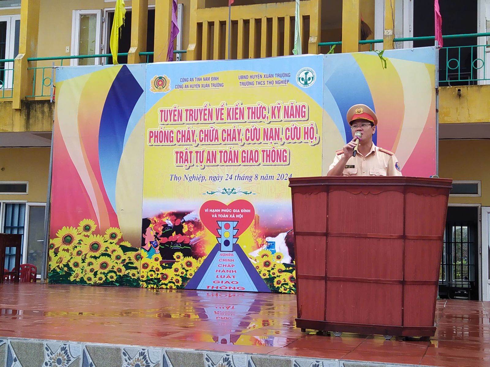 Thực hiện Chương trình phối hợp số 11/CTrPH-BCA-BGDĐT giữa Bộ Công an và Bộ Giáo dục và Đào tạo về tăng cường công tác tuyên truyền, phổ biến, giáo dục pháp luật về trật tự, an toàn giao thông trong các cơ sở giáo dục giai đoạn 2022-2025. Sáng ngày 24/8/2024, tại Trường THCS Thọ Nghiệp, Công an huyện Xuân Trường phối hợp với Trường THCS Thọ Nghiệp tổ chức buổi tuyên truyền, phổ biến, giáo dục pháp luật về trật tự an toàn giao thông, phòng cháy, chữa cháy và cứu nạn, cứu hộ.